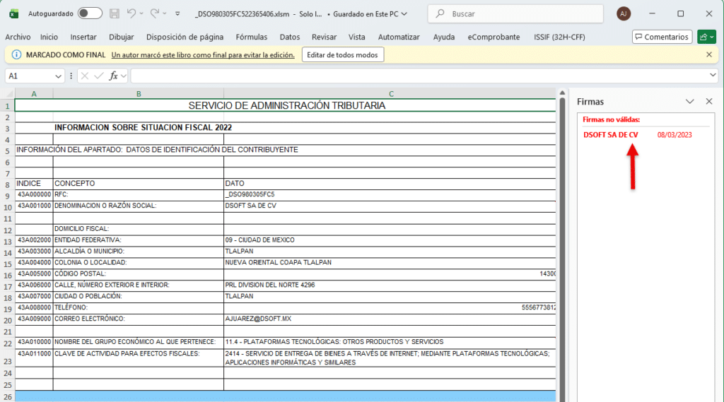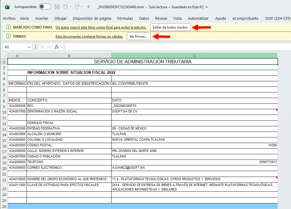 2. Al abrir el archivo, veremos dos líneas de estatus (barras amarillas) debajo de la Barra de Herramientas. La primera nos habilita la posibilidad de editar el archivo “Editar de todos modos” (abrirlo sin importar que se encuentra con una firma electrónica), mientras que la segunda nos permite “Ver Firmas” que mostrará la que se incluyó en el documento ISSIF del contribuyente que lo firmó.