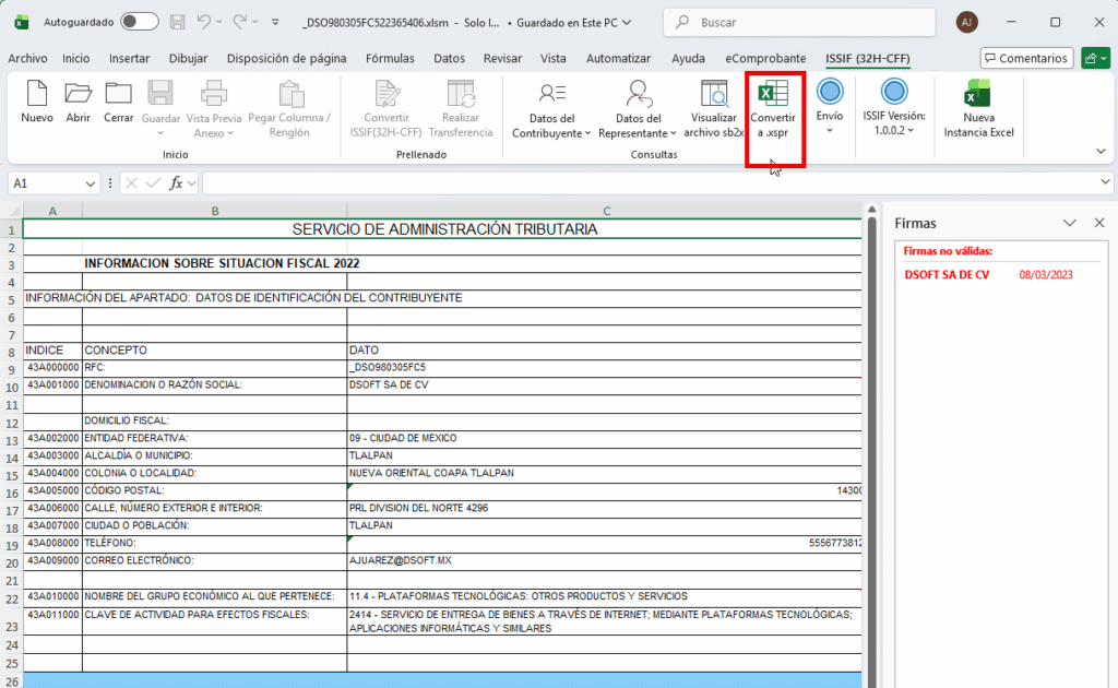 6. Tras abrir el documento en modo “Solo lectura” aparecerá en la barra de herramientas de ISSIF la opción de “Convertir a .xspr.“ Debemos dar clic en ese botón para realizar la acción.