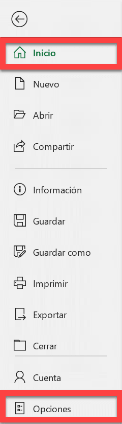 1. Ingresar al menú “Inicio” de Excel y hacer clic en “Opciones”.