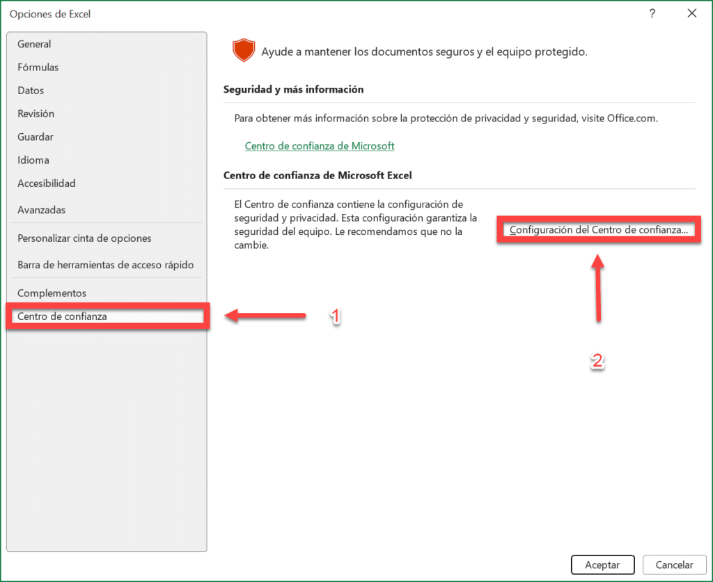 2. Ingresar a la opción “Centro de Confianza” y hacer clic en la opción “Configuración del Centro de Confianza”.