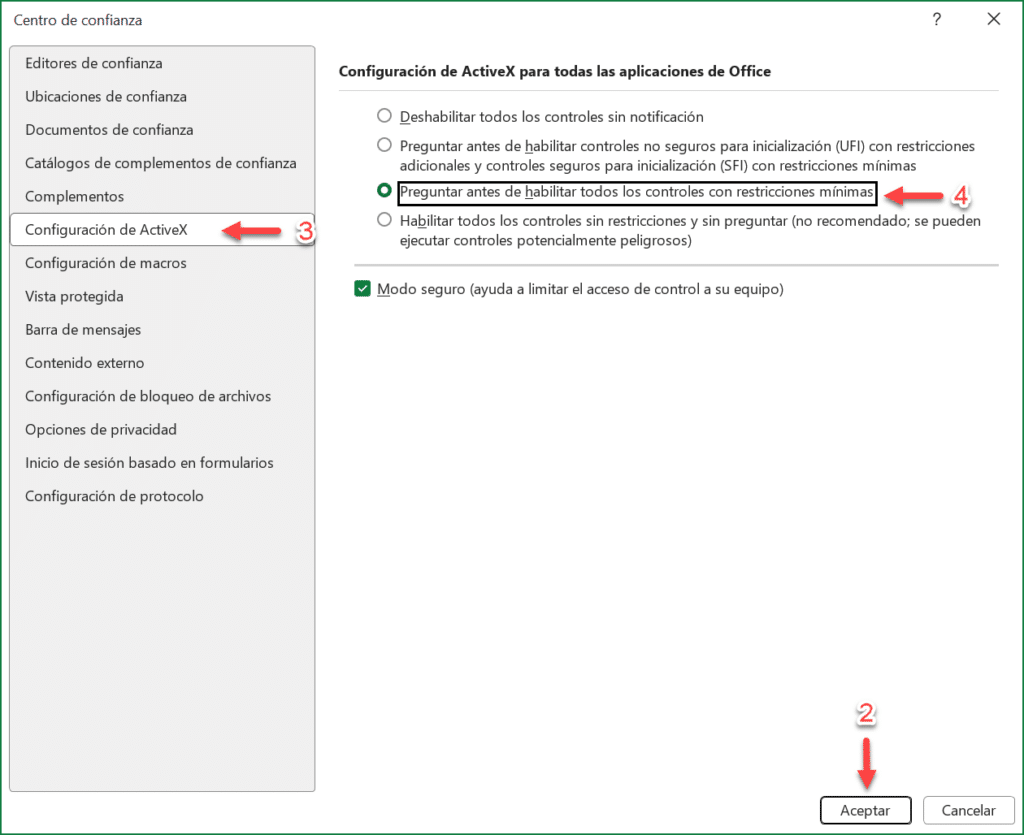 En ciertos equipos, los niveles de seguridad evitan que dichos controles se ejecuten automáticamente. Esto sucede cuando Excel cuenta con configuraciones restrictivas que bloquean los ActiveX como mecanismo de protección.