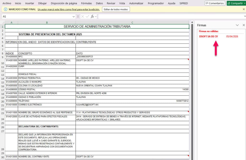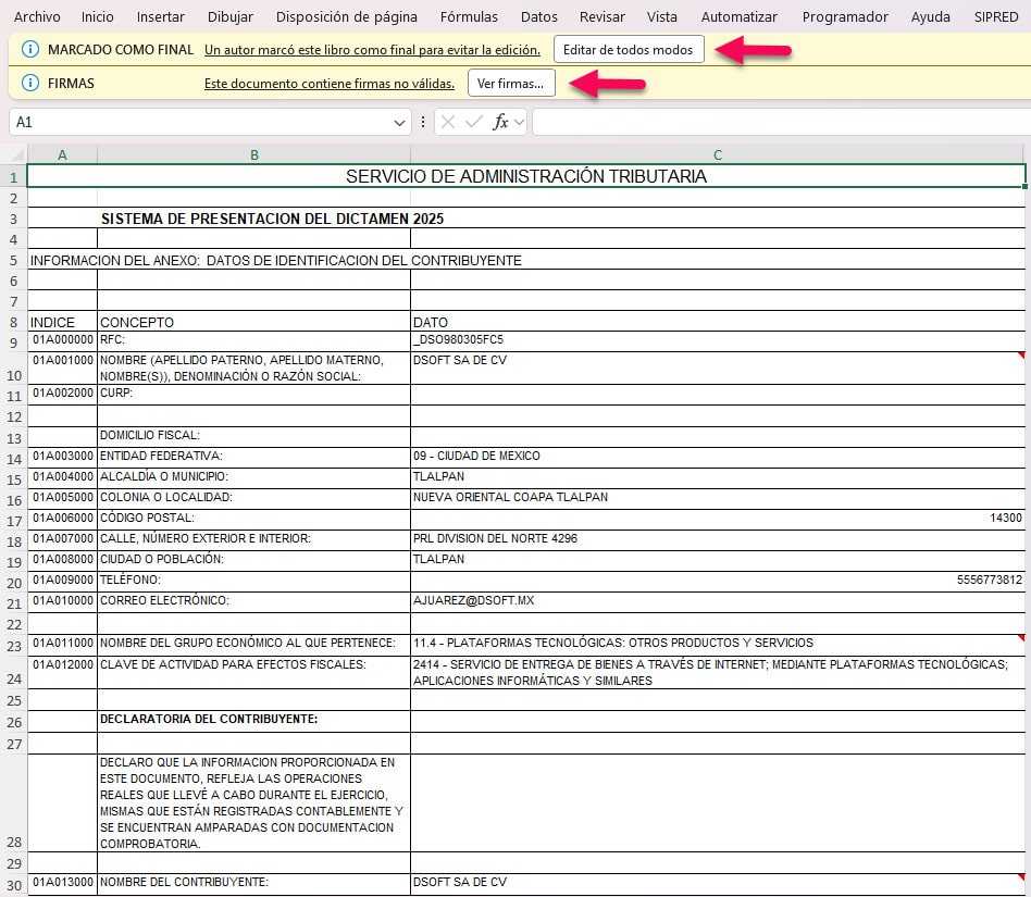 2. Al abrir el archivo, veremos dos líneas de estatus (barras amarillas) debajo de la Barra de Herramientas. La primera nos habilita la posibilidad de editar el archivo “Editar de todos modos” (abrirlo sin importar que se encuentra con una firma electrónica), mientras que la segunda nos permite “Ver Firmas” que mostrará la que se incluyó en el Dictamen Fiscal del contribuyente que lo firmó.