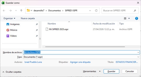 8. El sistema nos permitirá guardar el nuevo archivo “.XSPR”en una carpeta que le indiquemos al sistema.